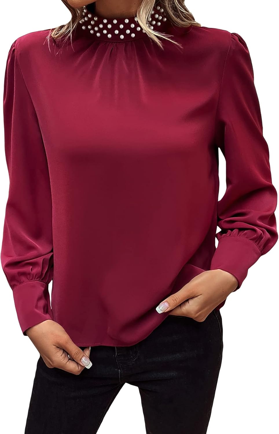 Makemechic Women S Pearls Beaded Mock Neck Keyhole Back Long Sleeve Blouse Black Xs At Amazon Women S Clothing Store